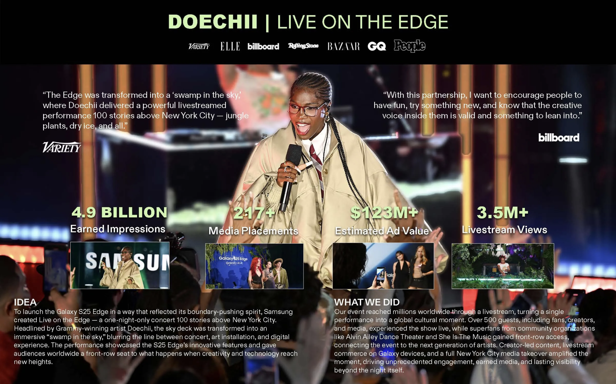 To celebrate the highly anticipated launch of the lightest, slimmest mobile device on the market (Galaxy S25 Edge), Samsung partnered with Grammy award-winner Doechii to produce an exclusive concert experience over 1,100 feet in the air, on the platform of the iconic Edge NYC.